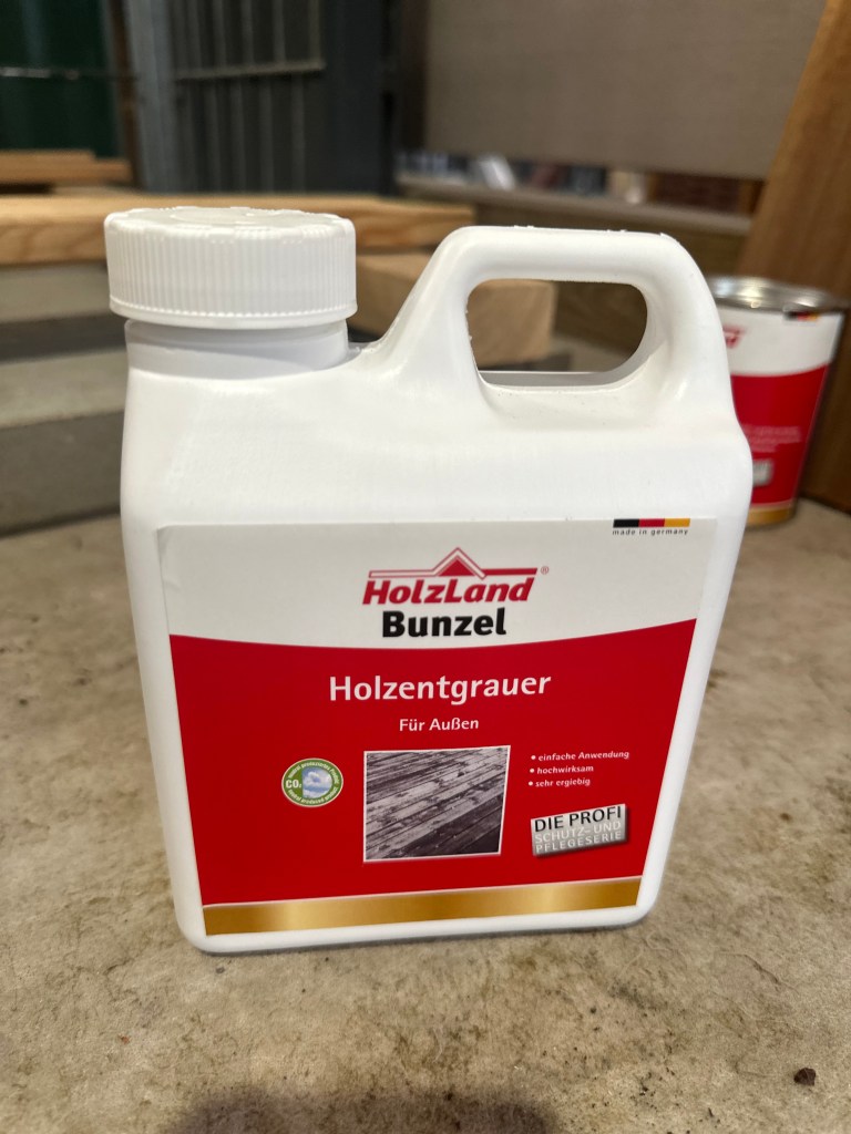 - Gründliche Reinigung: Verwenden Sie einen speziellen Holzreiniger und eine Bürste, um tiefsitzenden Schmutz zu entfernen. Bei stark vergrautem Holz kann ein Holzentgrauer helfen. Der Holzentgrauer wird dafür verwendet, um vergrautes Holz wieder in seinen ursprünglichen Zustand zu versetzen. Durch Witterungseinflüsse und UV-Strahlung kann Holz im Außenbereich mit der Zeit eine graue Patina entwickeln. Holzentgrauer hilft, diese Vergrauung zu entfernen und das Holz wieder frisch und natürlich aussehen zu lassen.
